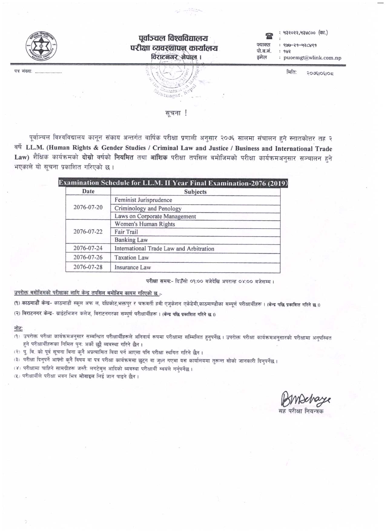 Board Exam Schedule for LL.M 2nd Year