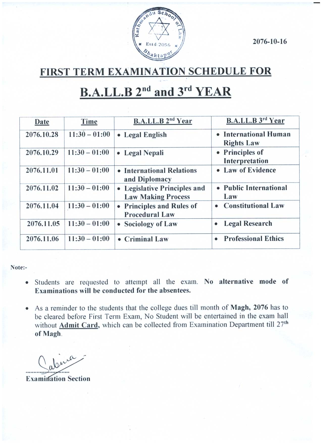 Exam Schedule for B.A.LL.B 2nd and 3rd year