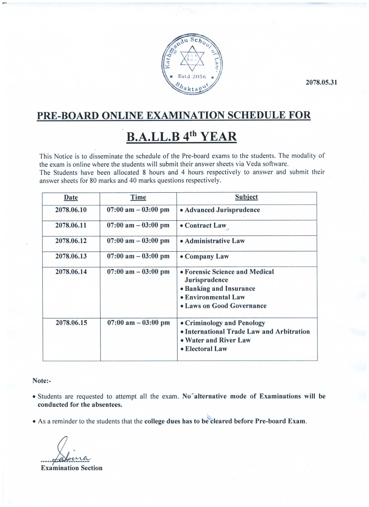 Pre - Board Exam Schedule for B.A.LL.B 4th Year
