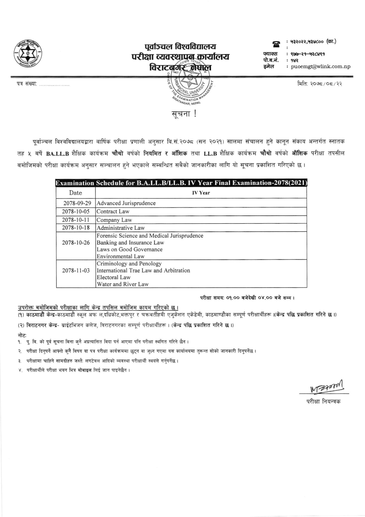 Board Exam Schedule for B.A.LL.B 4th Year