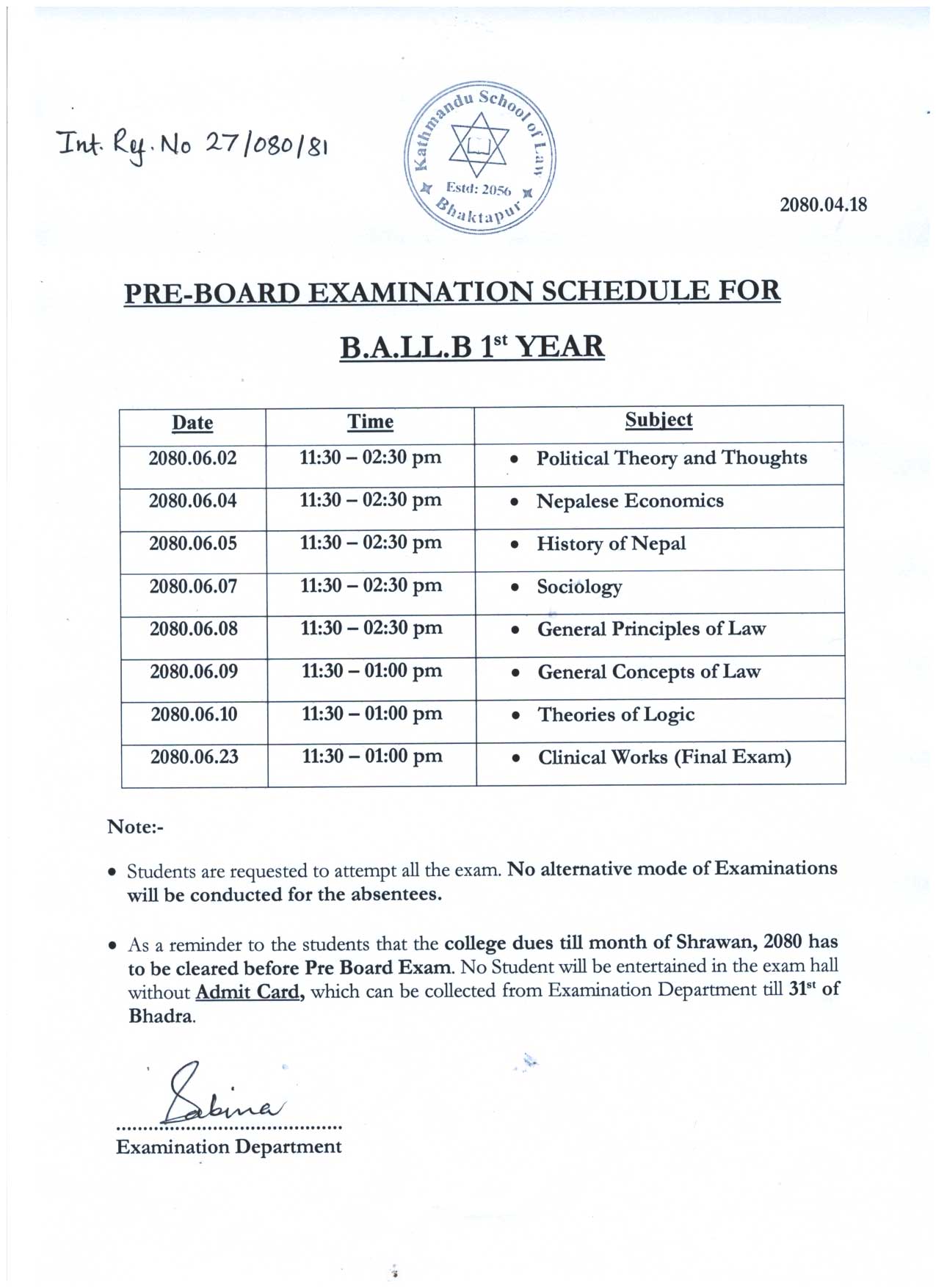 Pre-Board Examination Schedule for B.A.LL. B 1st Year