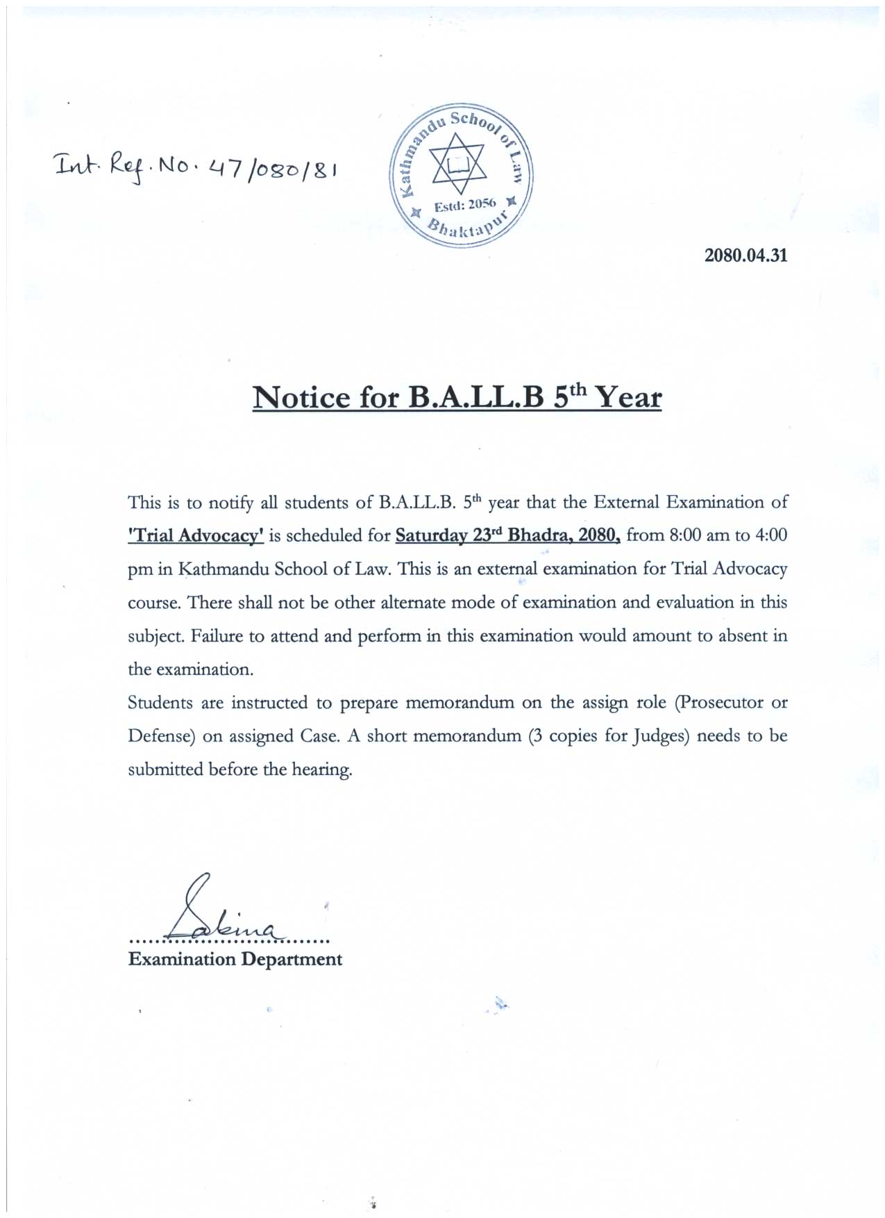 Notice regarding Trial Advocacy for B.A. LL. B 5th Year