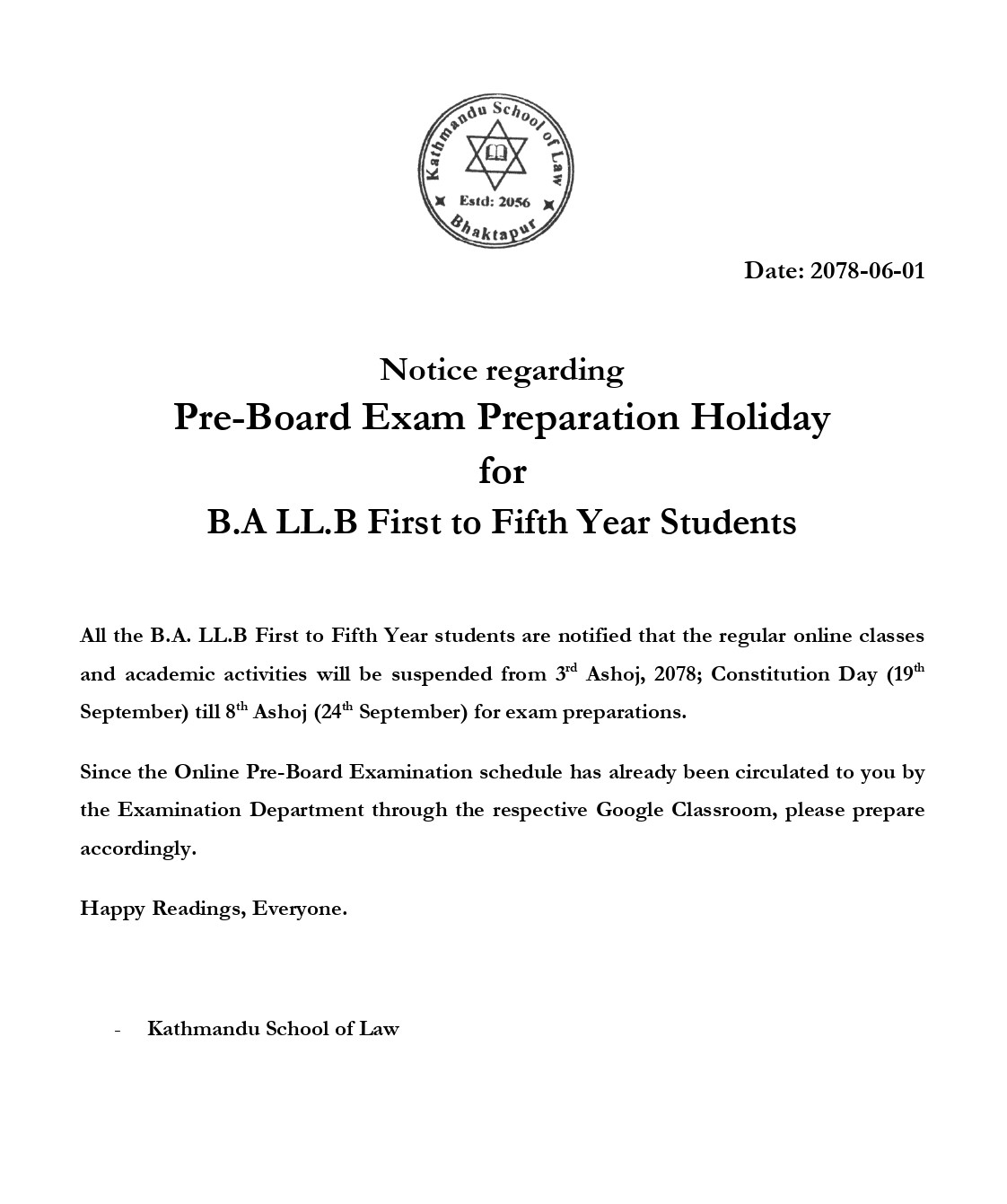 Notice regarding Pre-Board Exam Preparation Holiday for B.A LL.B First to Fifth Year Students