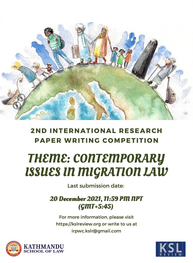 Kathmandu School of Law Review is organizing the 2nd International Research Paper Writing Competition on the theme "Contemporary Issues in Migration Law". The top three research papers will receive prize money and a certificate of recognition. Last date to submit the research paper is 20th December 2021.