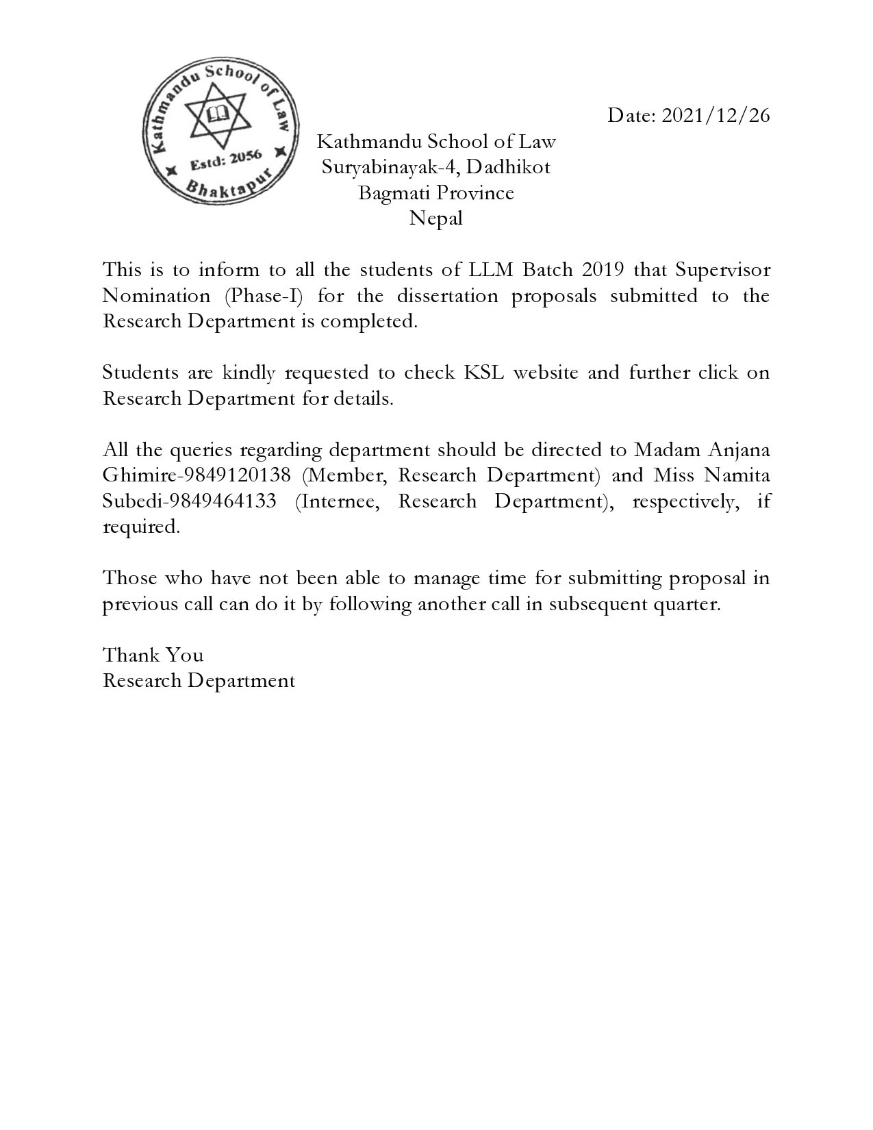 Notice Regarding Supervisor Nomination for LLM