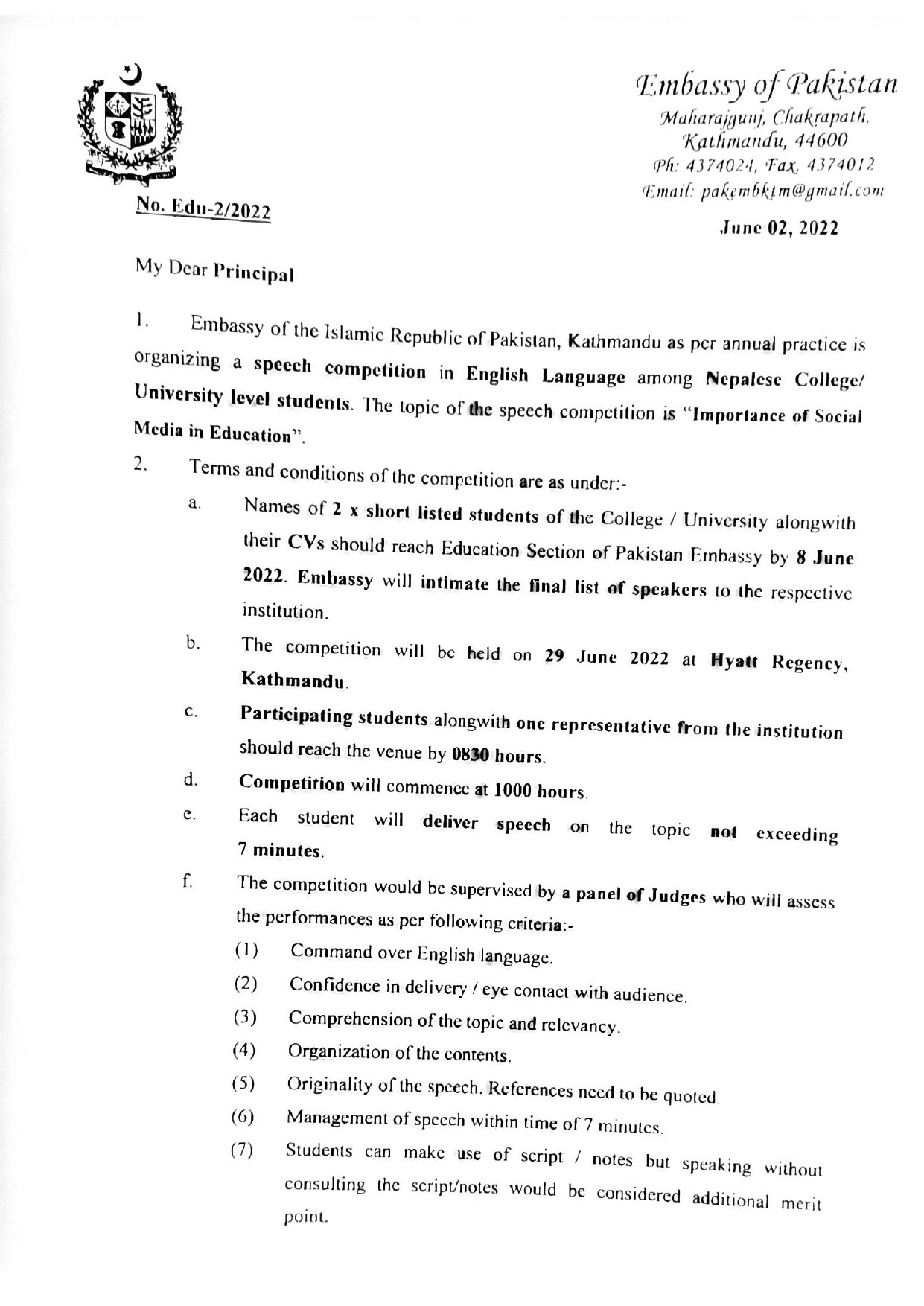Speech competition organized by Embassy of the Islamic Republic of Pakistan