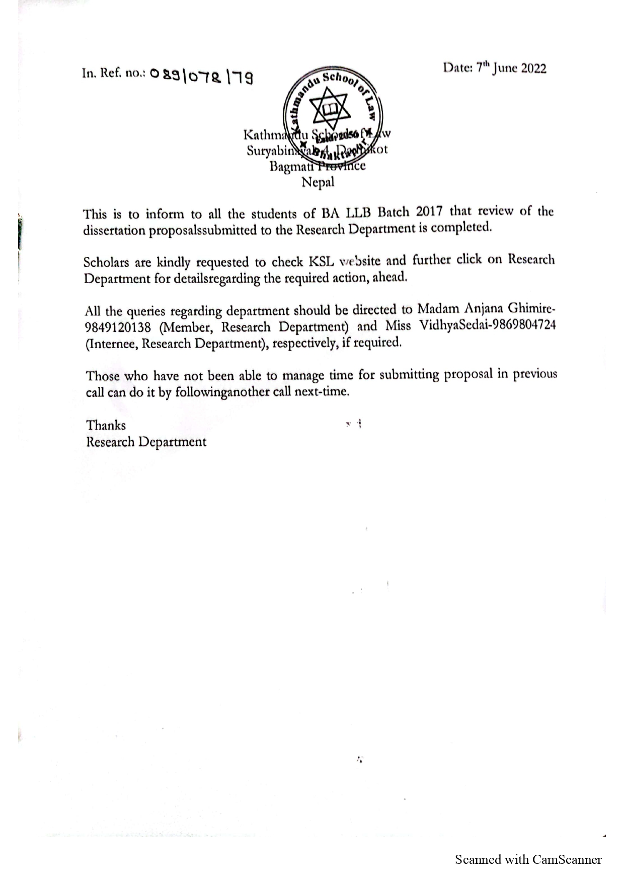 Notice Regarding Review of the Dissertation Proposal