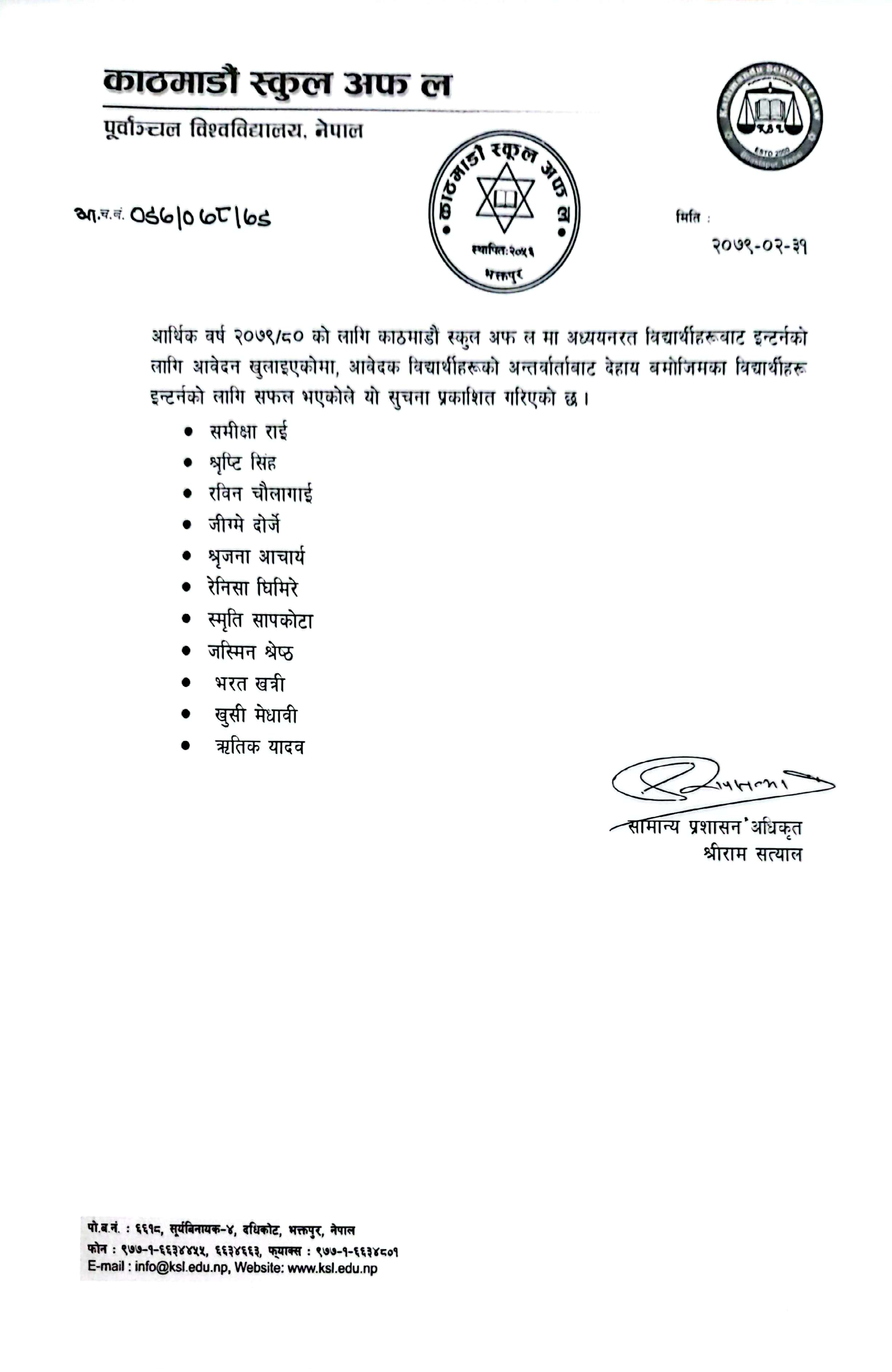 List of students selected for Internship