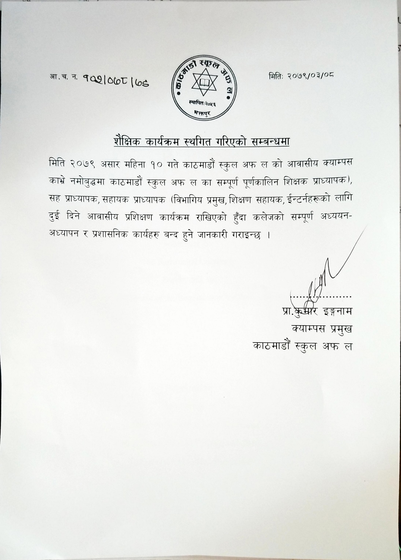 Notice of Suspension of Regular Classes Due to Election