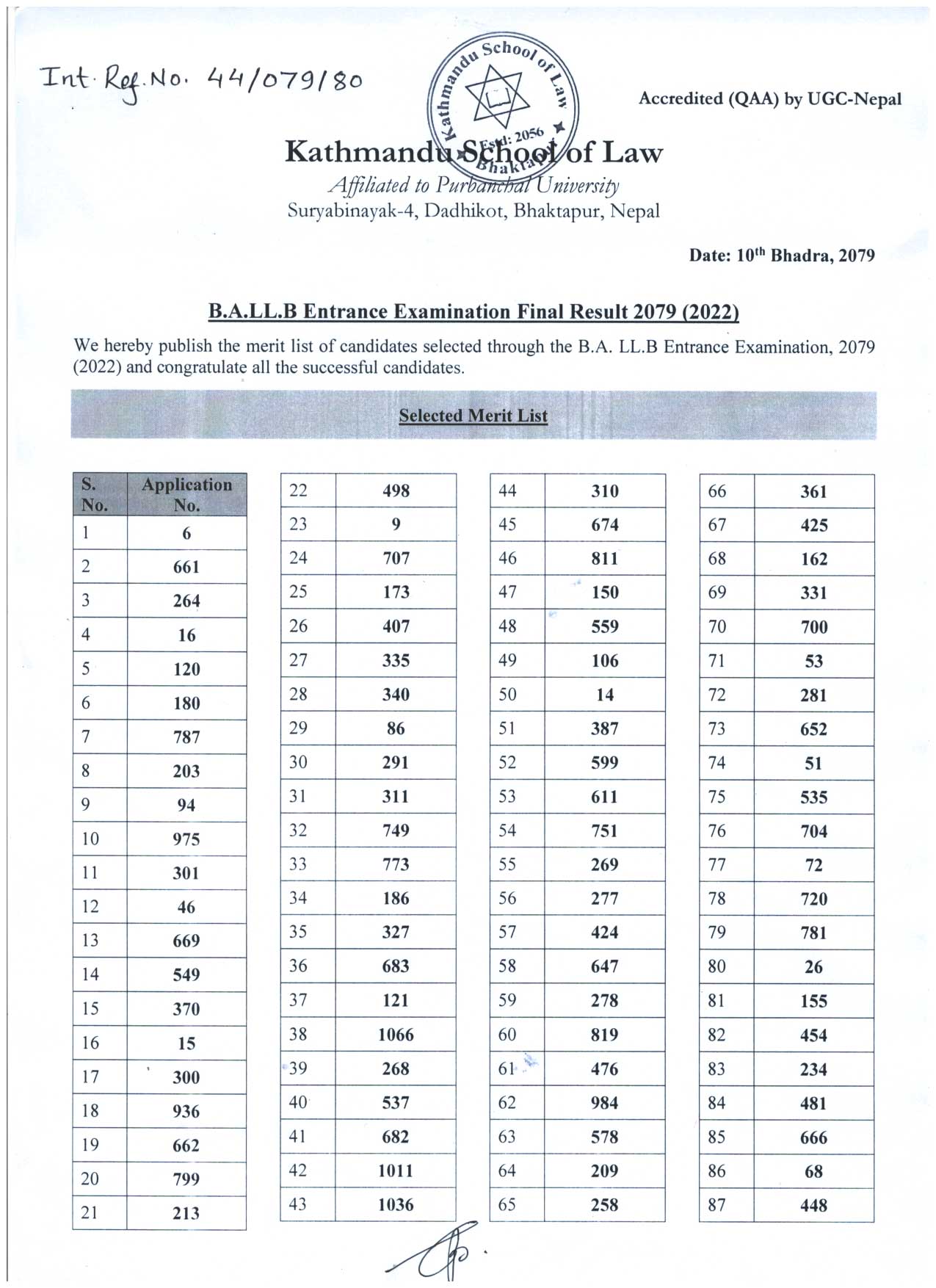 B.A. LL.B Entrance Examination Final Result 2079 (2022)