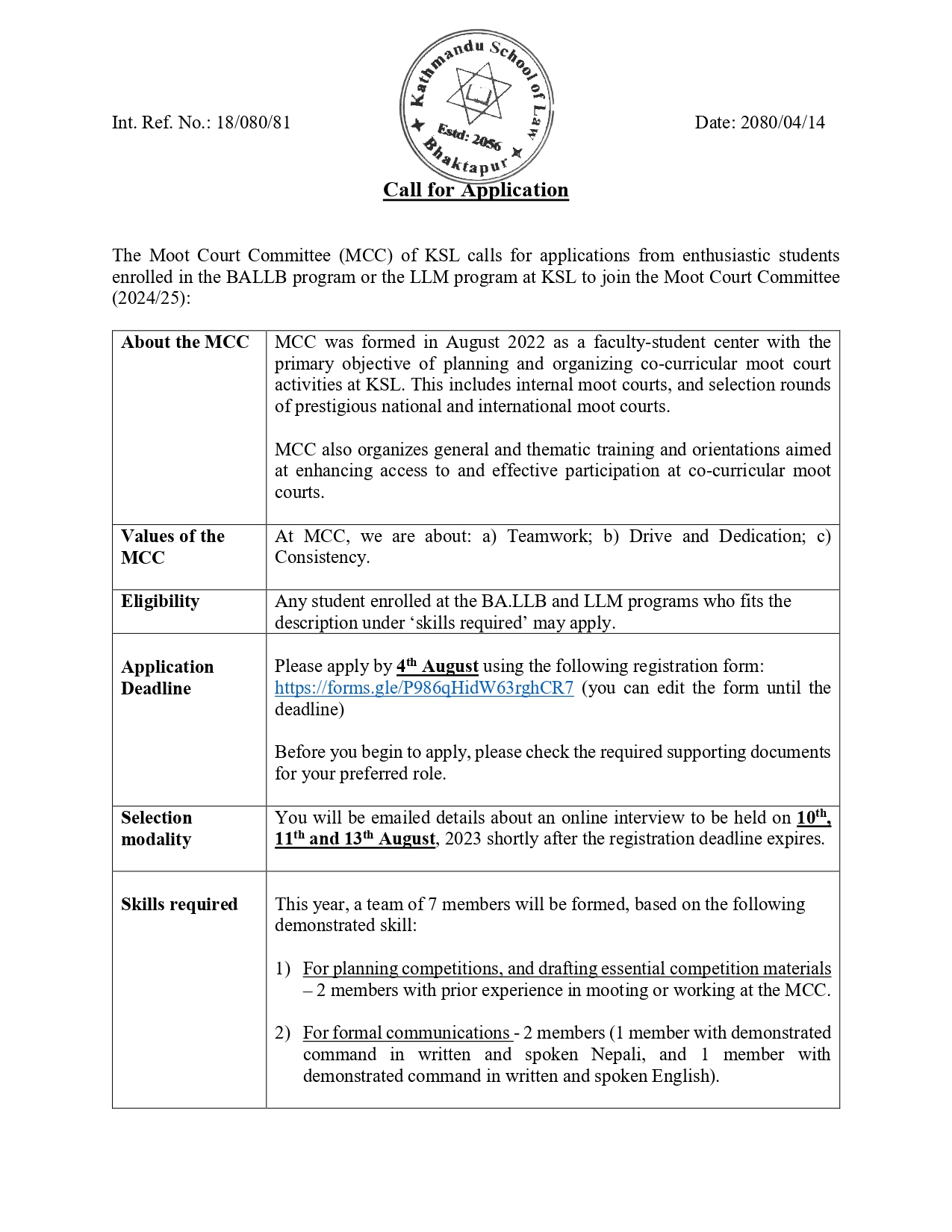 KSL Moot Court Committee call for an application