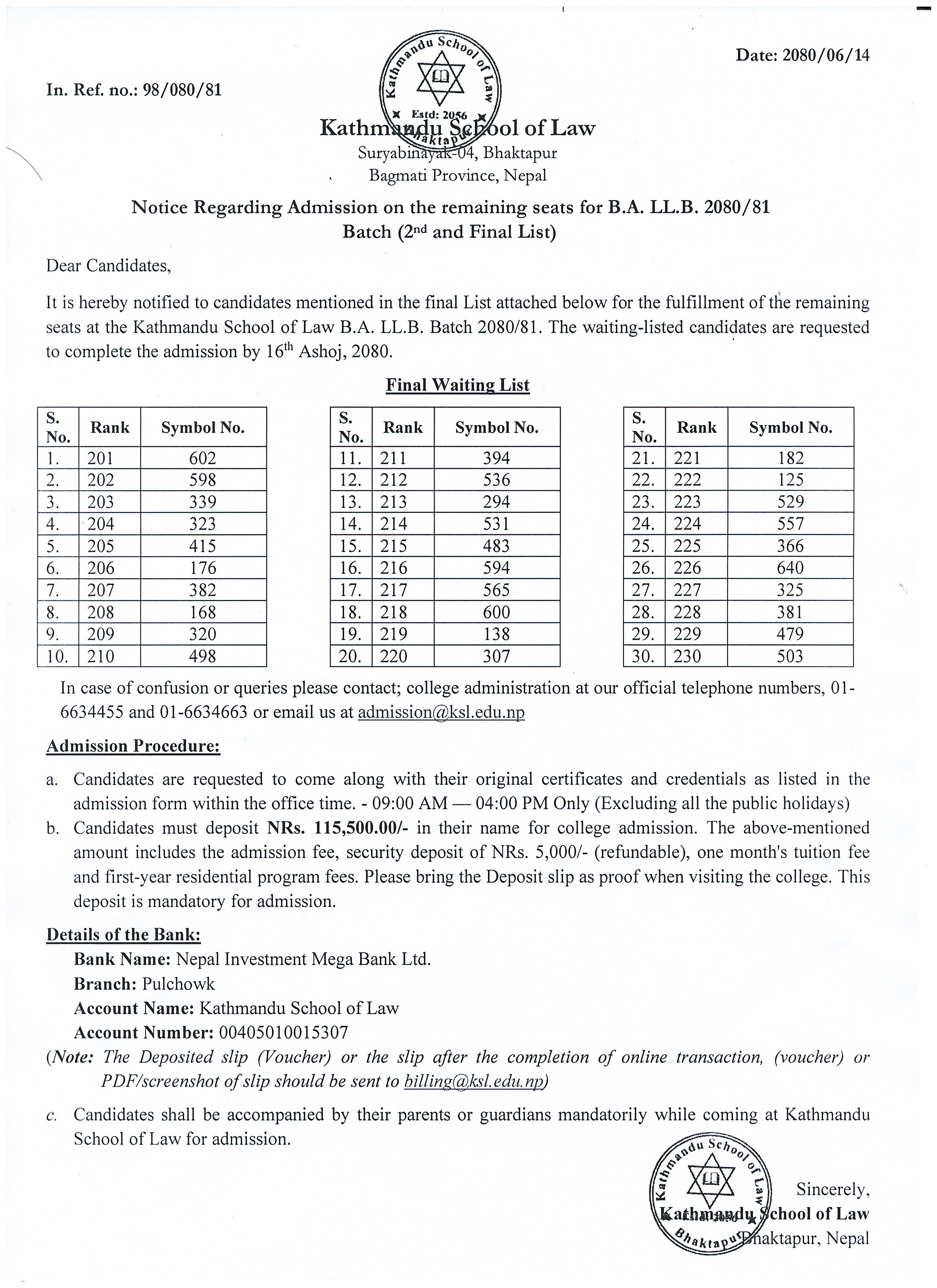 Notice Regarding Admission on the remaining seats for B.A. LL.B. 2080/81 Batch (Final Waiting List)