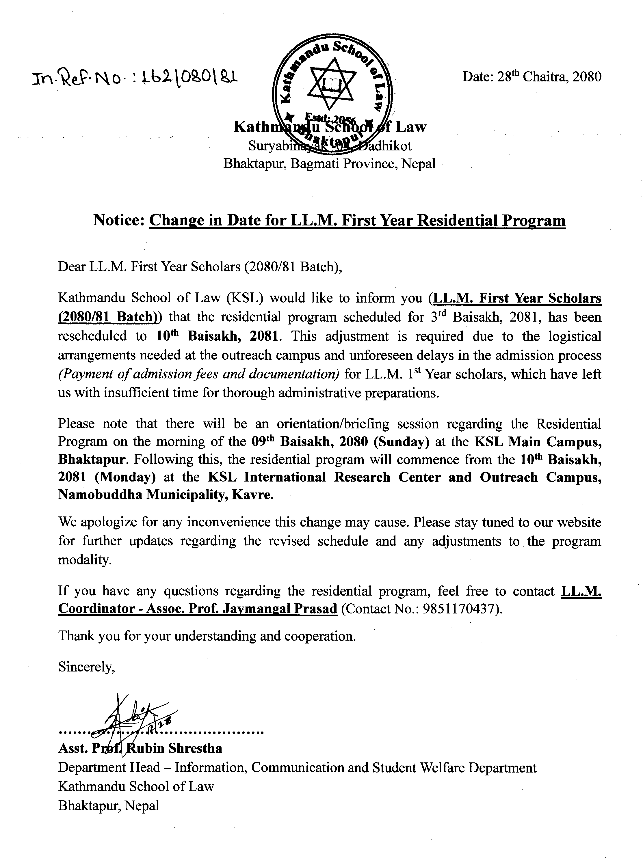 Notice Regarding LL.M. First Year (Batch 2080/81) Residential Program