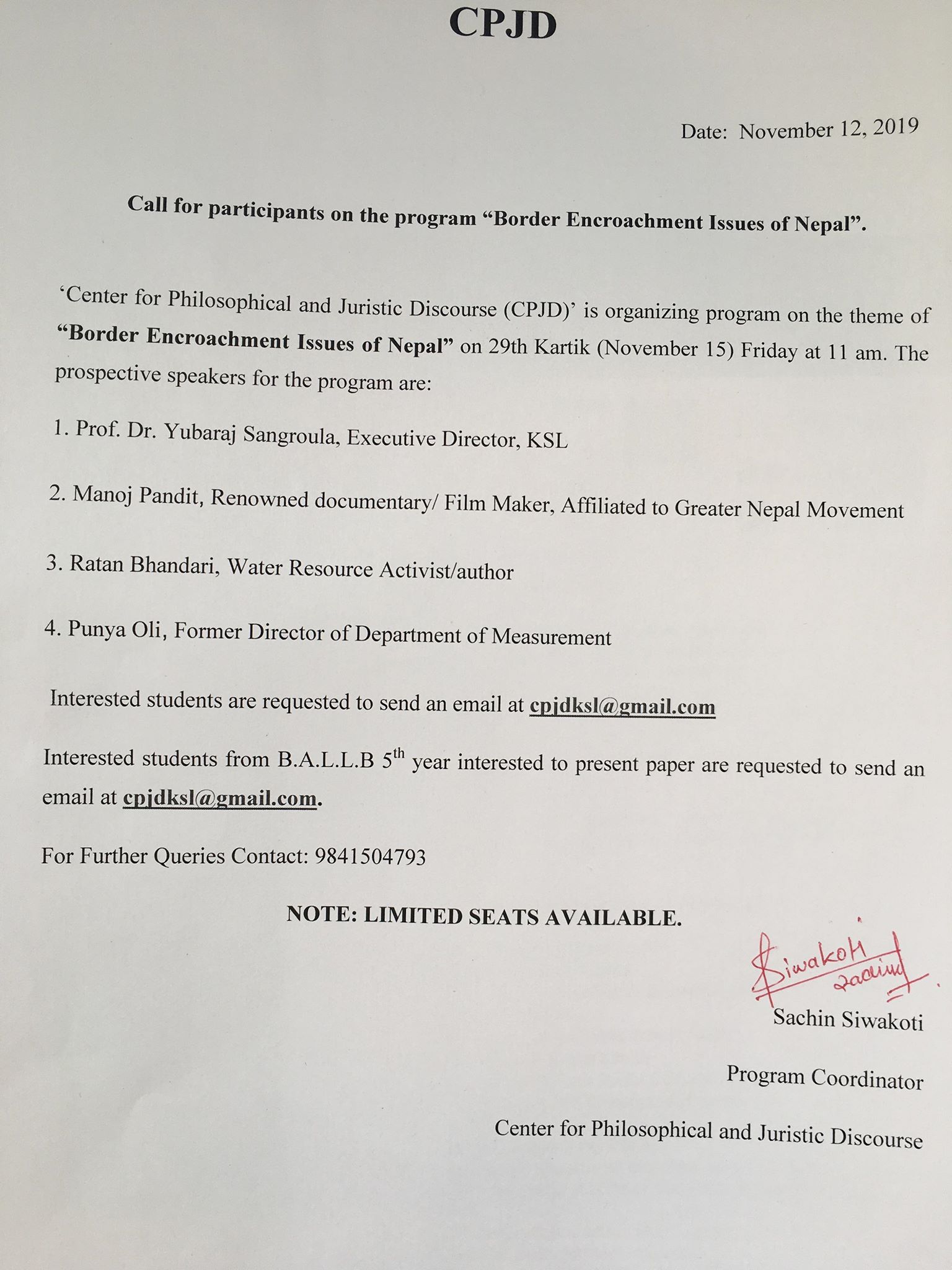 Call for participants on the program "Border Encroachment Issues of Nepal"