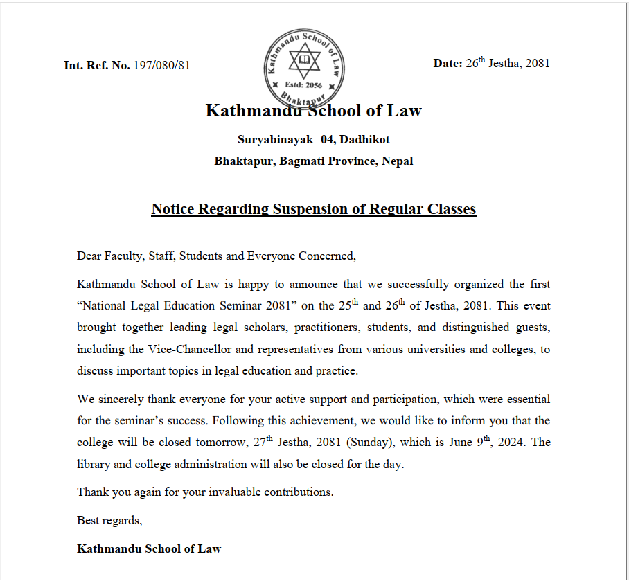 NOTICE REGARDING SUSPENSION OF REGULAR CLASSES AND POSTPONEMENT OF EXAMINATIONS