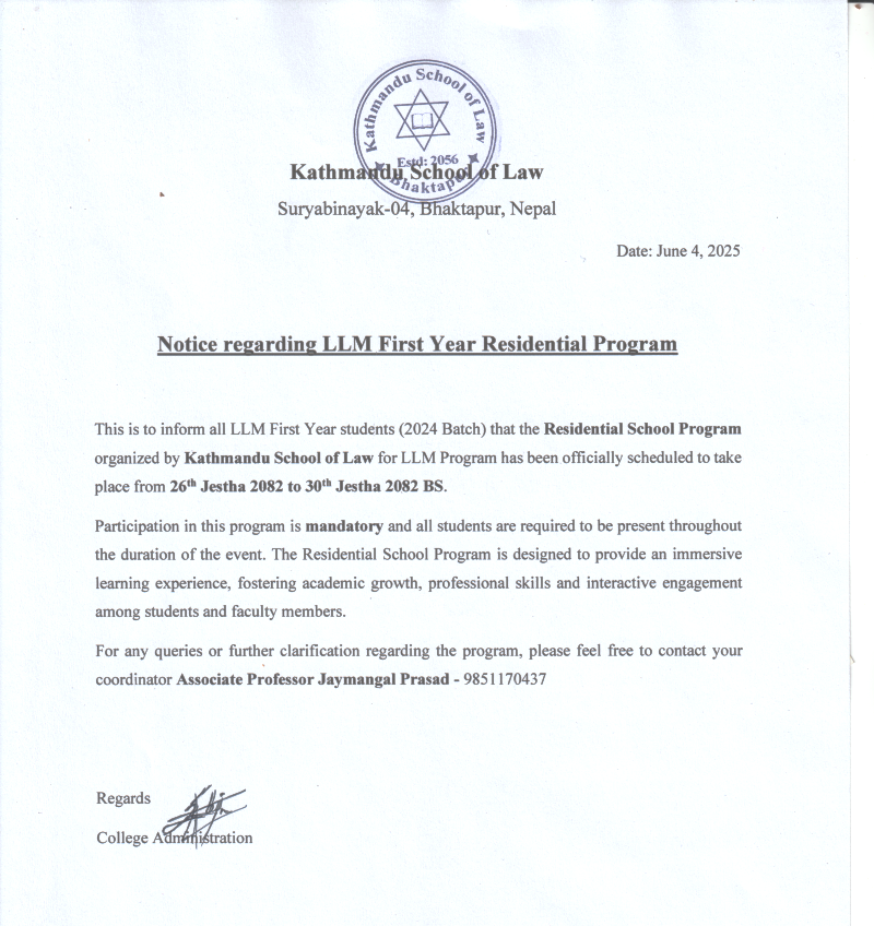 This is to inform all LLM First Year students (2024 Batch) that the Residential School Program organized by Kathmandu School of Law for LLM Program has been officially scheduled to take place from 26th Jestha 2082 to 30th Jestha 2082 BS.
