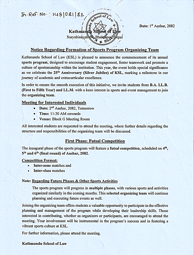 Kathmandu School of Law (KSL) is pleased to announce the commencement of its annual sports program, designed to encourage student engagement, foster teamwork and promote a culture of sportsmanship within the institution. This year, the event holds special significance as we celebrate the 25th Anniversary (Silver Jubilee) of KSL, marking a milestone in our journey of academic and extracurricular excellence.