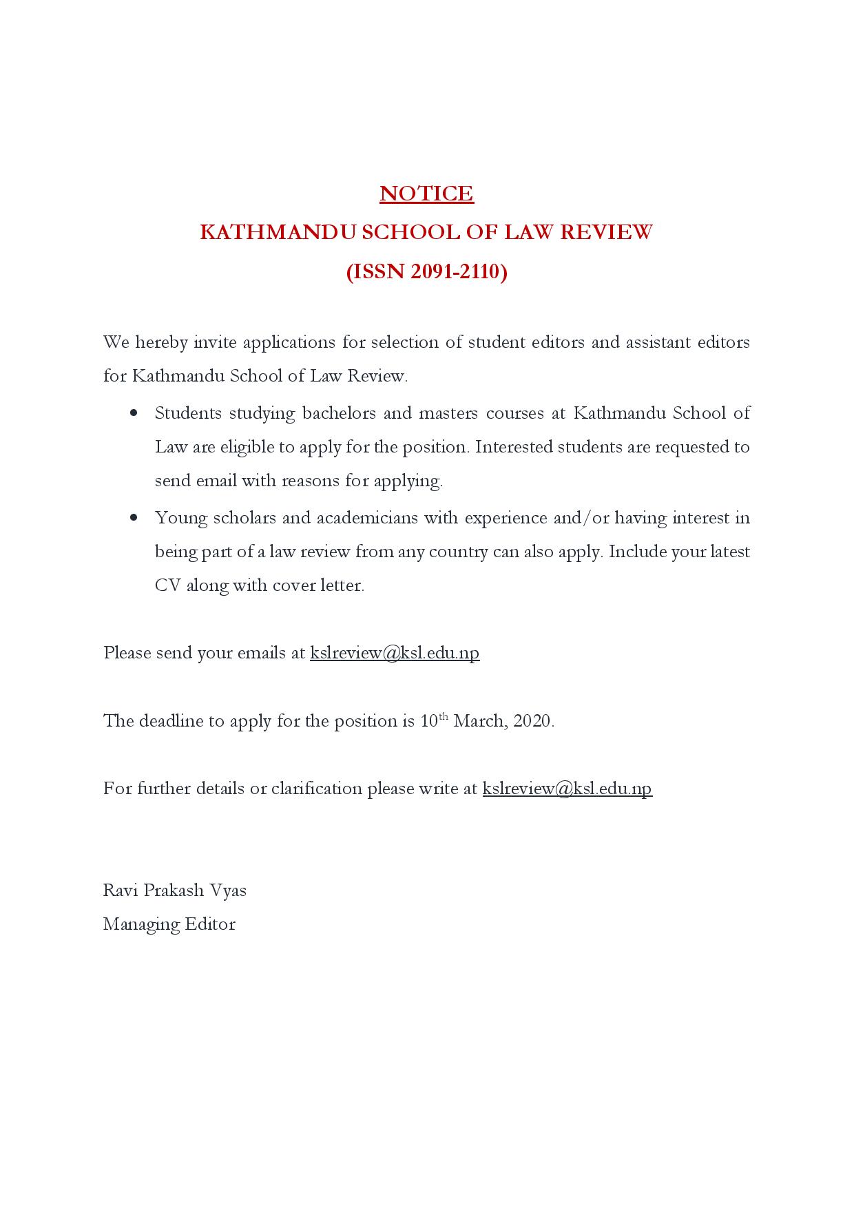 We hereby invite applications for selection of student editors and assistant editors for Kathmandu School of Law Review