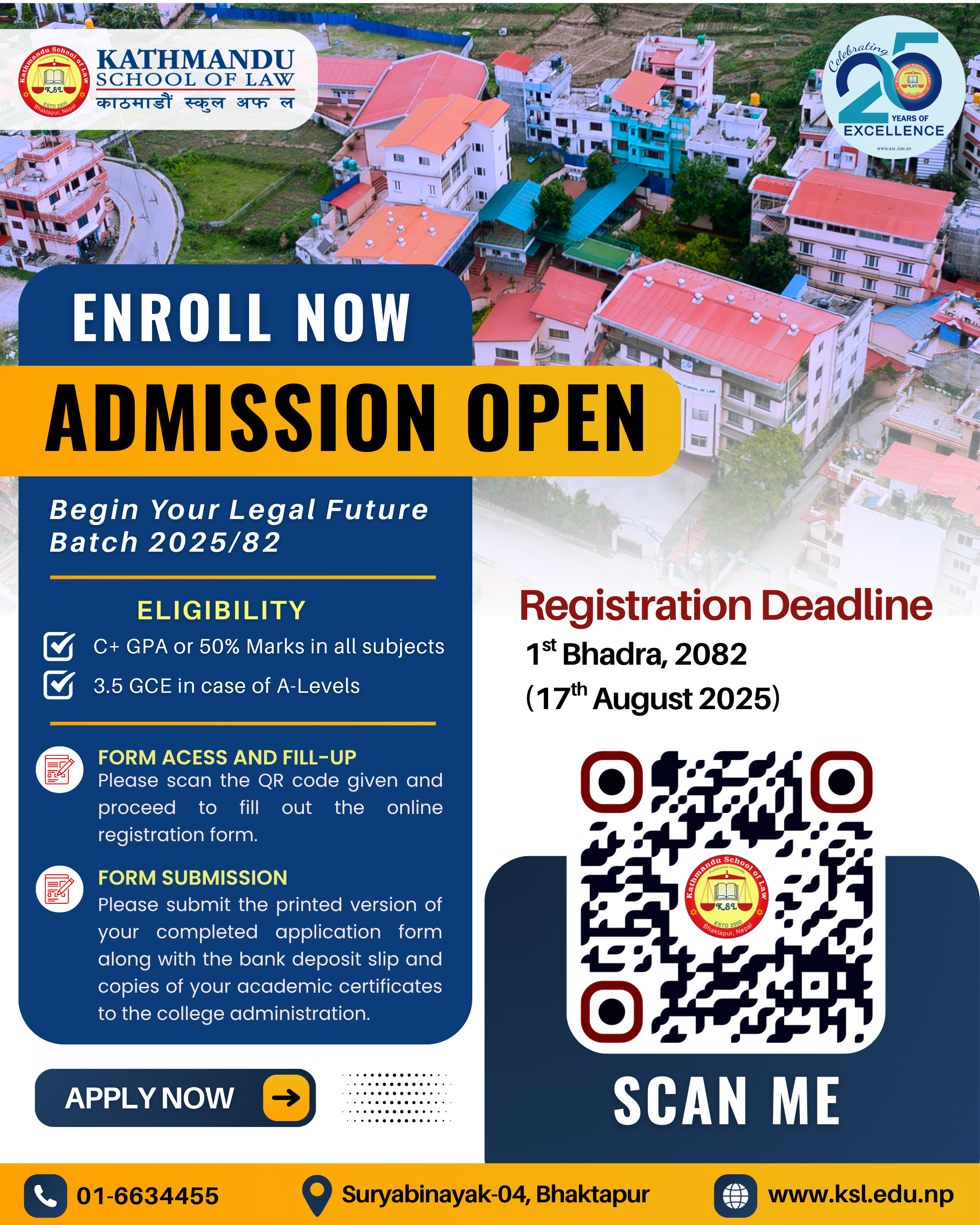 Kathmandu School of Law (KSL) announces an extension in the submission of entrance application forms for B.A. LL.B. program (2082 Batch).