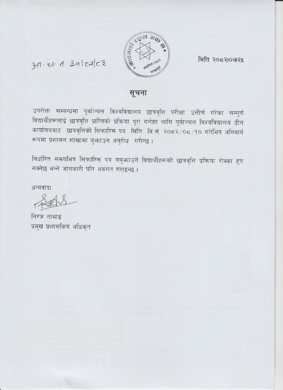सूचना: पूर्वाञ्चल विश्वविद्यालय छात्रवृत्ति सिफारिस पत्र बुझाउने बारे