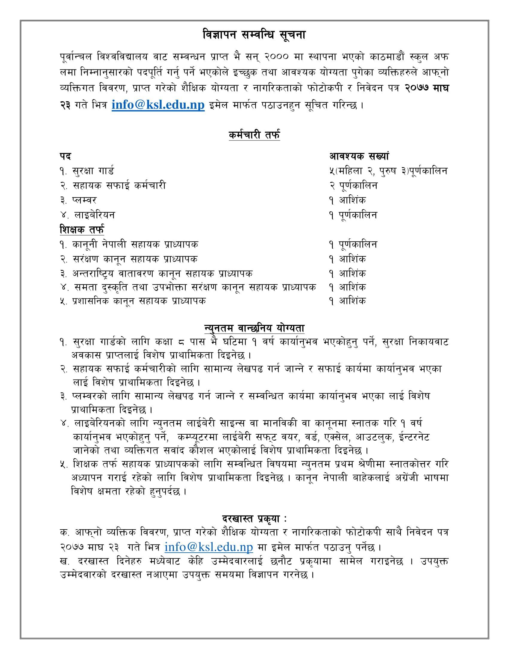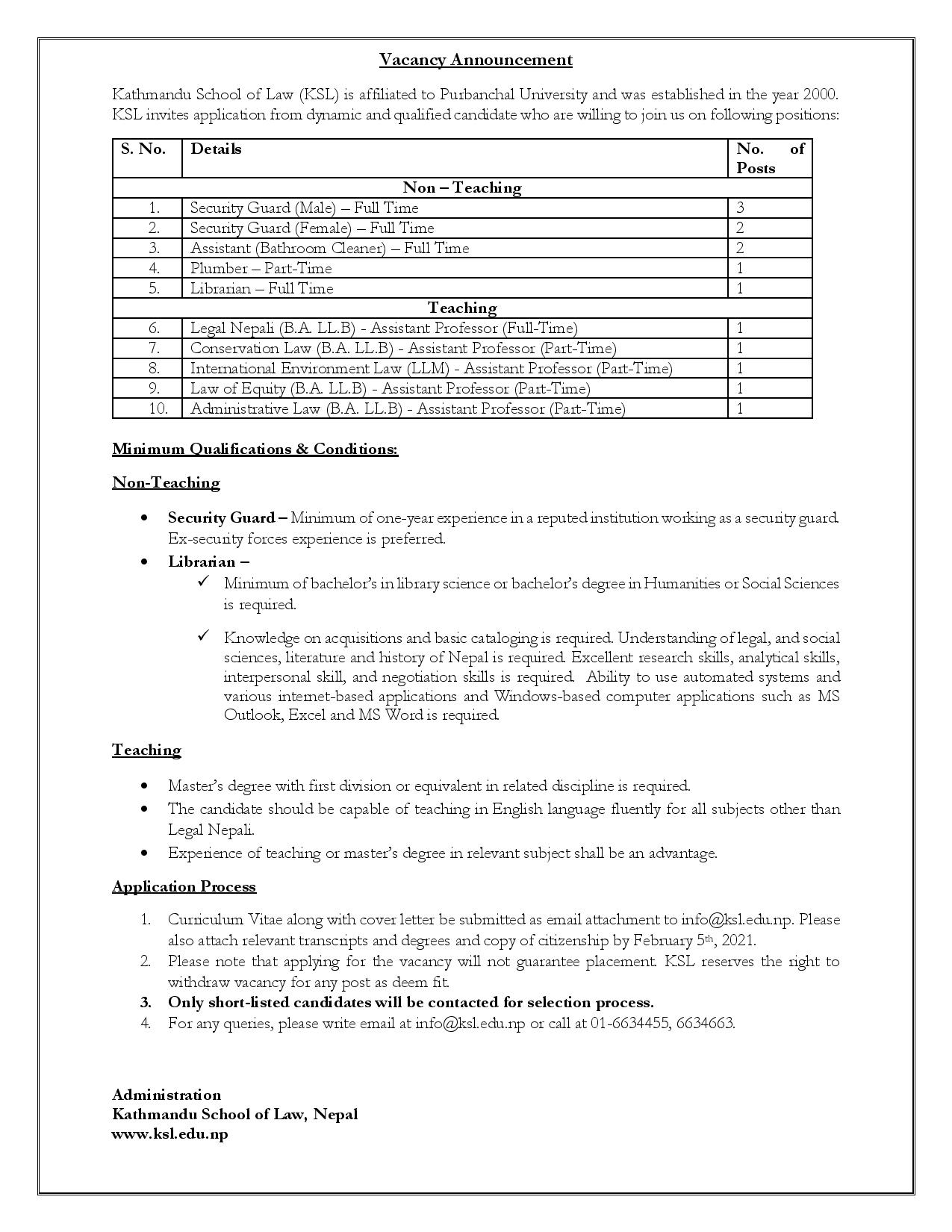 Please send your updated CV along with your documents attached to info@ksl.edu.np