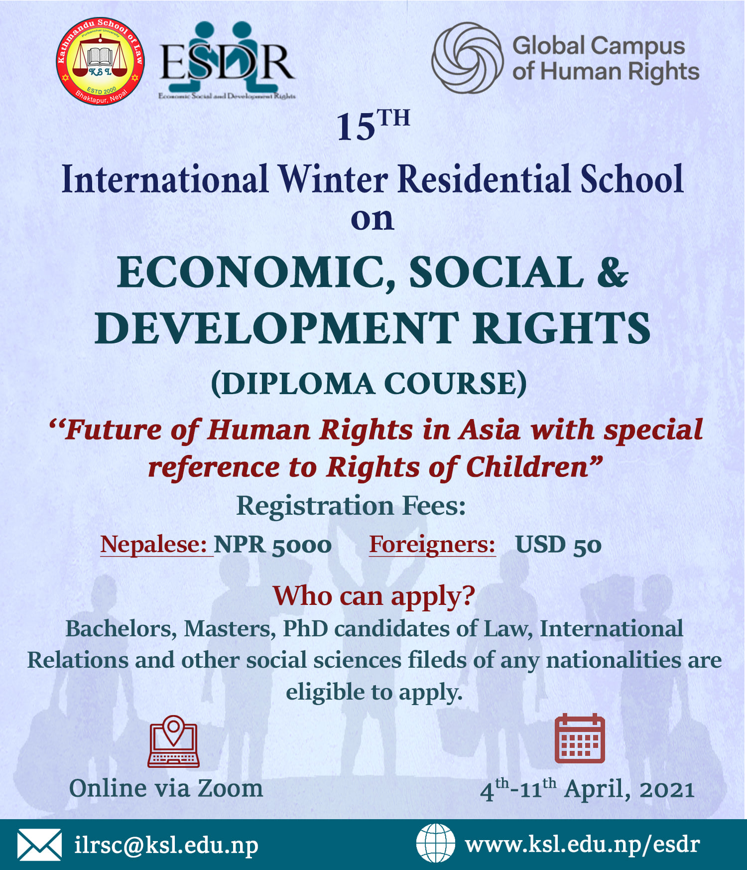 Owing to the cancellation of the in-person winter residential school, Kathmandu School of Law brings you the online edition of the 15th International Winter Residential School (Diploma Course) on Economic Social Developmental Rights from 4th to 11th April 2021.