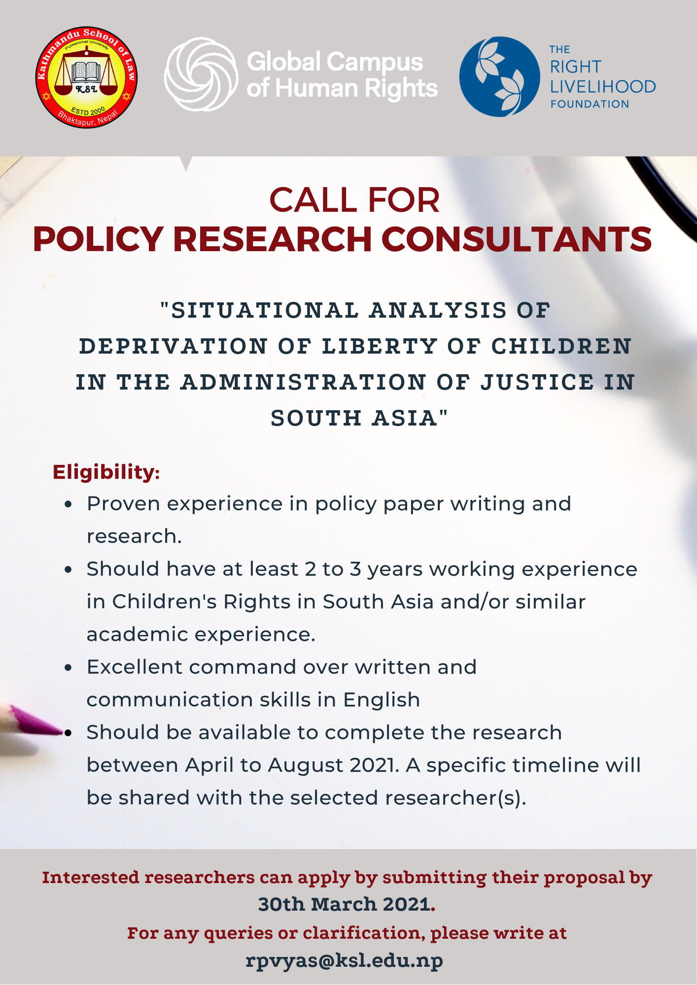 Kathmandu School of Law is looking for one (1) Policy Research Consultant from (7) SAARC countries, i.e., Afghanistan, Bangladesh, Bhutan, India, the Maldives, Pakistan, and Sri Lanka for the research project ‘Situational Analysis of Deprivation of Liberty of Children in The Administration of Justice in South Asia’. Supported by Right to Livelihood Foundation and Global Campus of Human Rights.