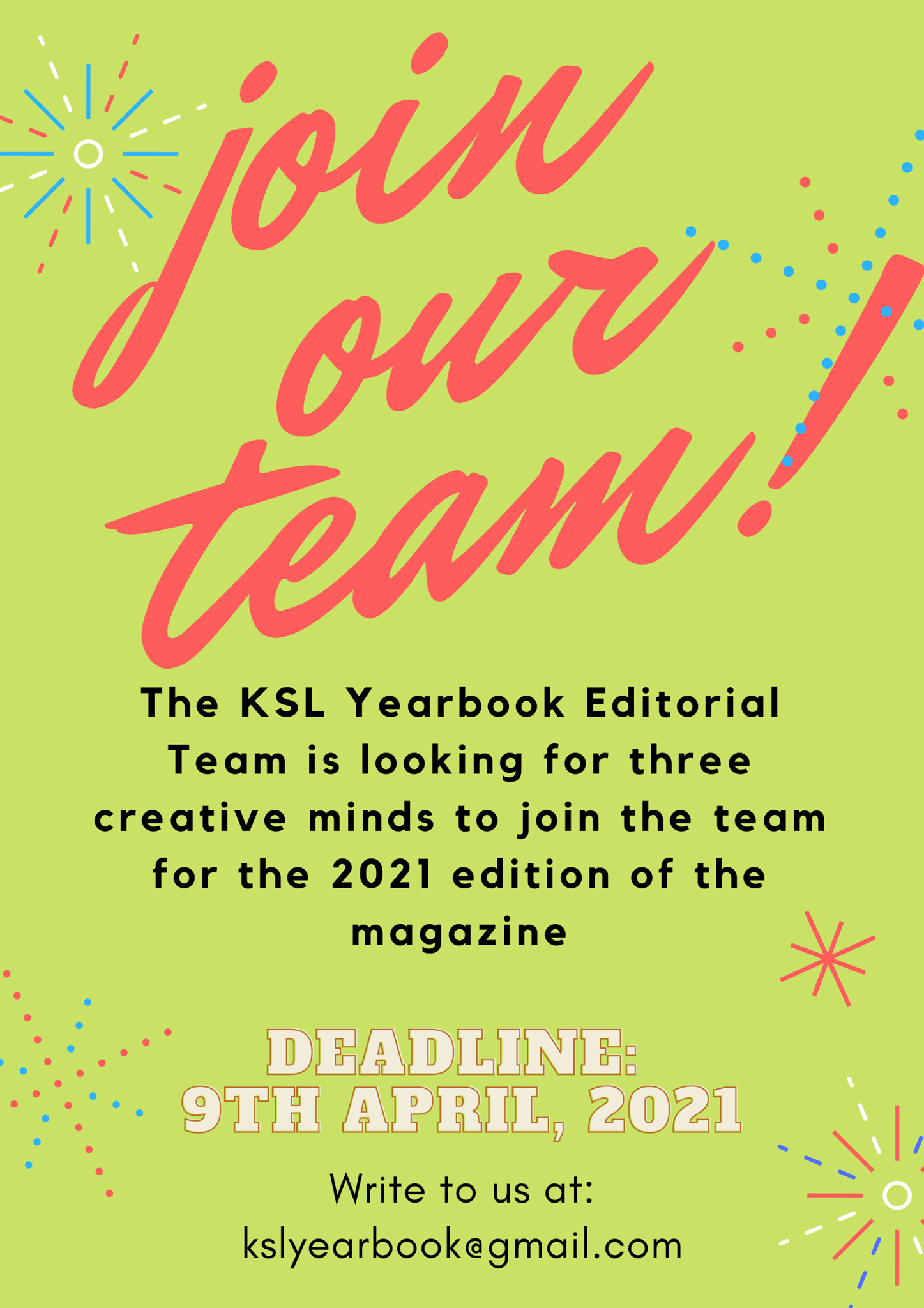 If you think you meet the requirements, please send in a letter of interest along with your CV at "kslyearbook@gmail.com" by 9th April, 2021. Students from 1st to 4th year are encouraged to apply.