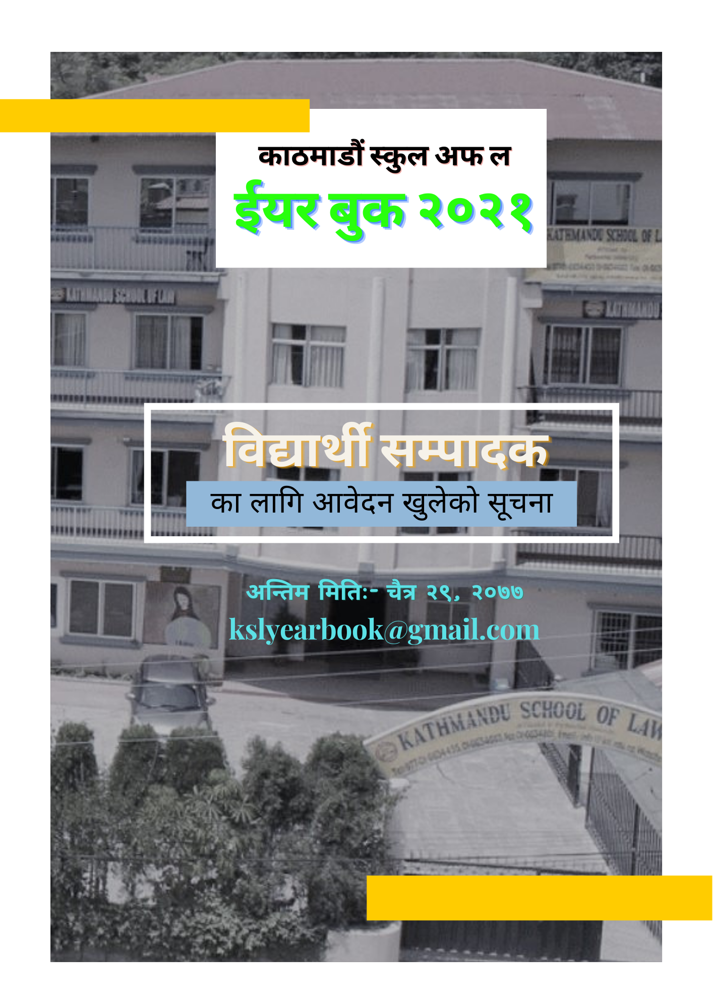 यदि तपाईँ इच्क्षुक हुनुहुन्छ भने हामीलाई "kslyearbook@gmail.com" मा इमेल गर्न सक्नु हुनेछ।