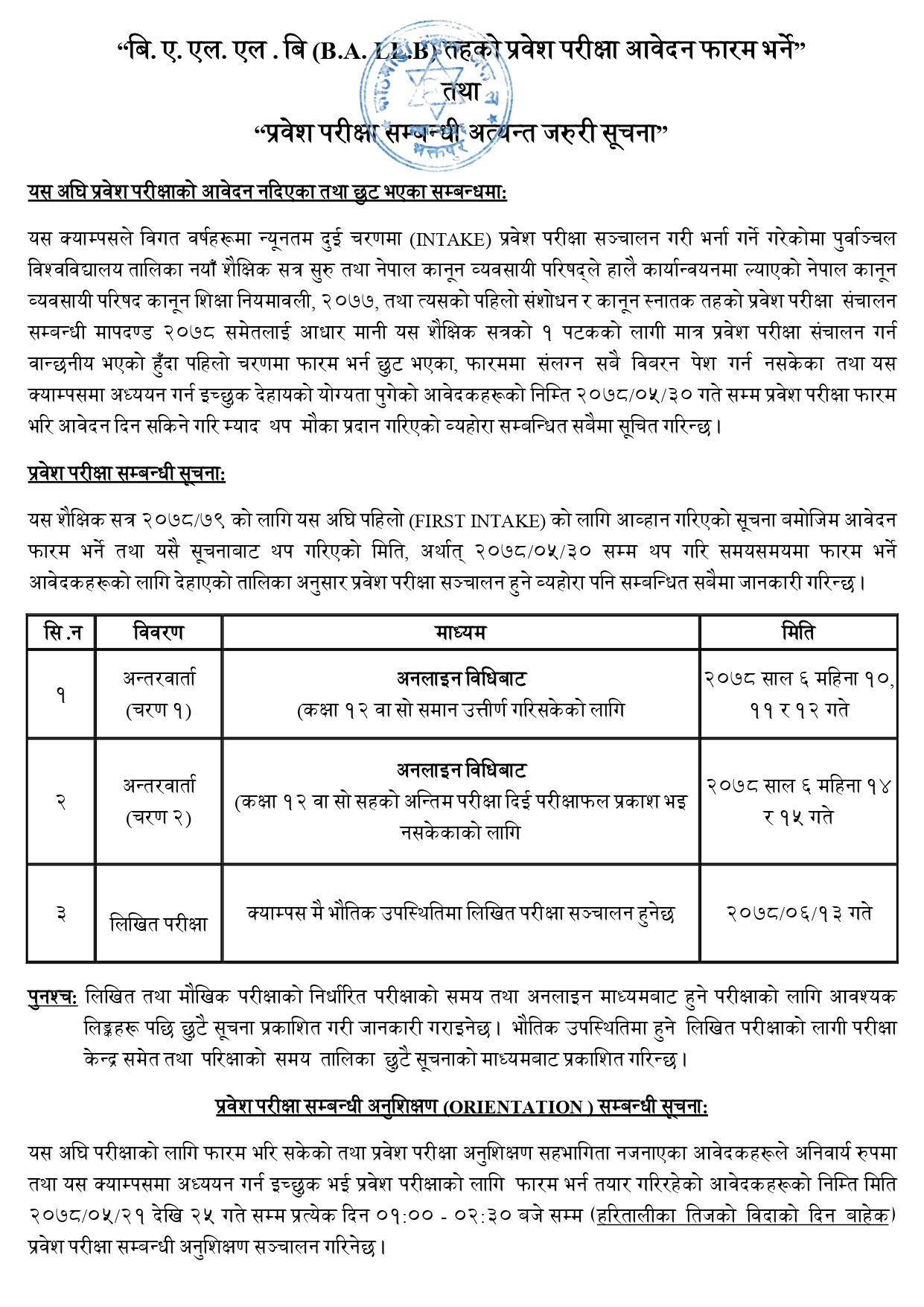 यस क्याम्पसले विगत वर्षहरूमा न्यूनतम दुई चरणमा (INTAKE) प्रवेश परीक्षा सञ्चालन गरी भर्ना गर्ने गरेकोमा पुर्वाञ्चल विश्वविद्यालय तालिका नयाँ शैक्षिक सत्र सुरु तथा नेपाल कानून व्यवसायी परिषद्ले हालै कार्यान्वयनमा ल्याएको नेपाल कानून व्यवसायी परिषद कानून शिक्षा नियमावली, २०७७, तथा त्यसको पहिलो संशोधन र कानून स्नातक तहको प्रवेश परीक्षा संचालन सम्बन्धी मापदण्ड २०७८ समेतलाई आधार मानी यस शैक्षिक सत्रको १ पटकको लागी मात्र प्रवेश परीक्षा संचालन गर्न वान्छनीय भएको हुँदा पहिलो चरणमा फारम भर्न छुट भएका, फारममा संलग्न सबै विबरन पेश गर्न नसकेका तथा यस क्याम्पसमा अध्ययन गर्न इच्छुक देहायको योग्यता पुगेको आवेदकहरूको निम्ति २०७८/०५/३० गते सम्म प्रवेश परीक्षा फारम भरि आवेदन दिन सकिने गरि म्याद थप मौका प्रदान गरिएको व्यहोरा सम्बन्धित सबैमा सूचित गरिन्छ।