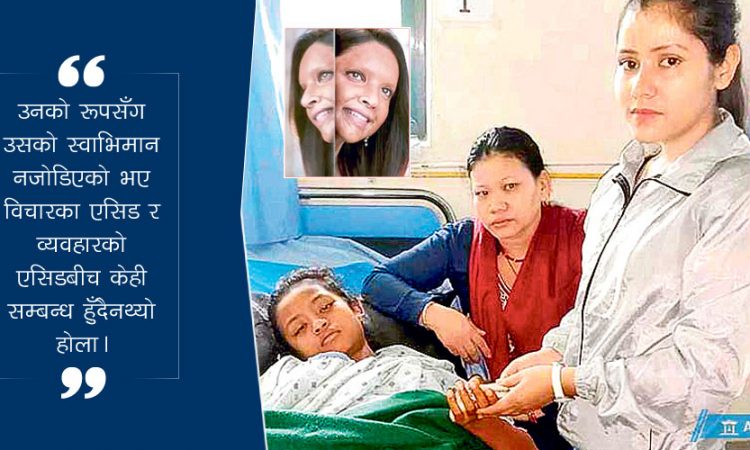 कतिलाई बाहिरी रूपको खासै महत्व नहोला। तर जब कसैले ‘कम महत्व’को आफ्नै रूपलाई ‘कुरूप’ बनाउने प्रयास गर्छ, तब यो स्वाभिमानसँग जोडिएर आउँछ। ‘रूपको अधिकार’लाई बाँच्न पाउने अधिकारबाट छुट्ट्याएर हेर्न मिल्दैन। रिसईवीका कारण कसैलाई कुरूप बनाउन गरिने एसिड एट्याक अर्थात् तेजाब आक्रमणबारे केही बेर घोत्लिऔं, न हामी।